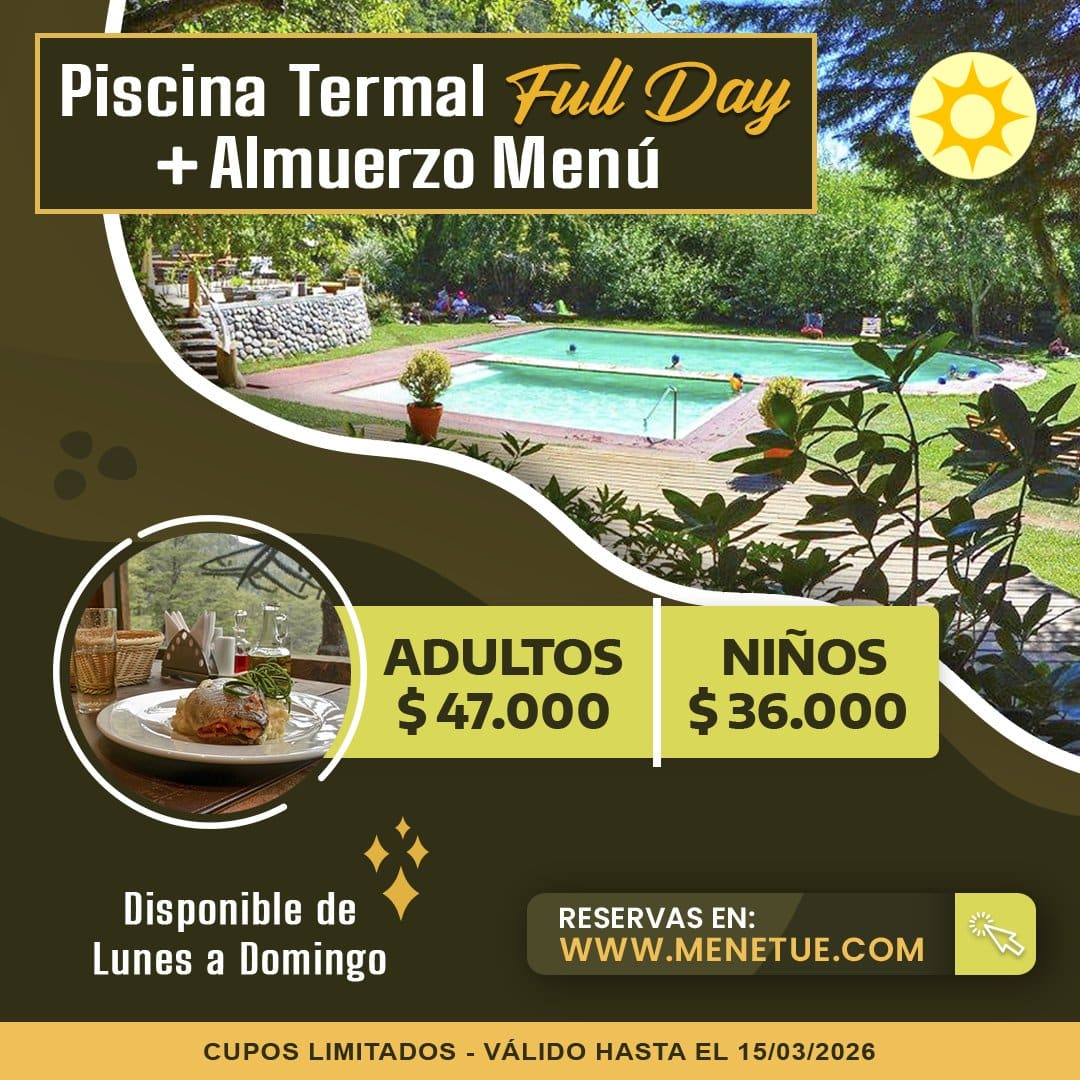 Ven a disfrutar de un día de relajo en nuestras piscinas. Llénate de energía con nuestras aguas termales Menetue y aprovecha de relajarte en un entorno maravilloso